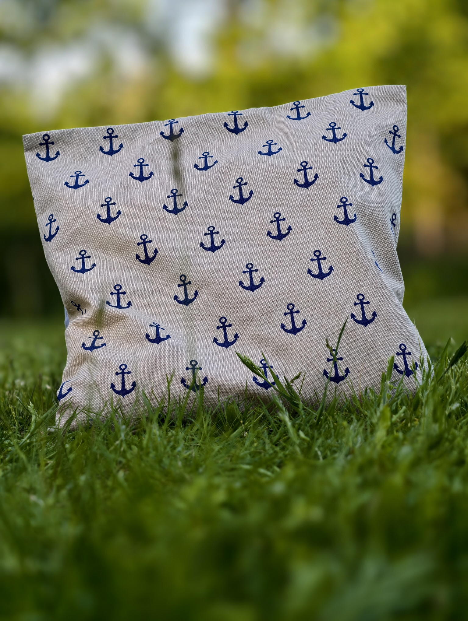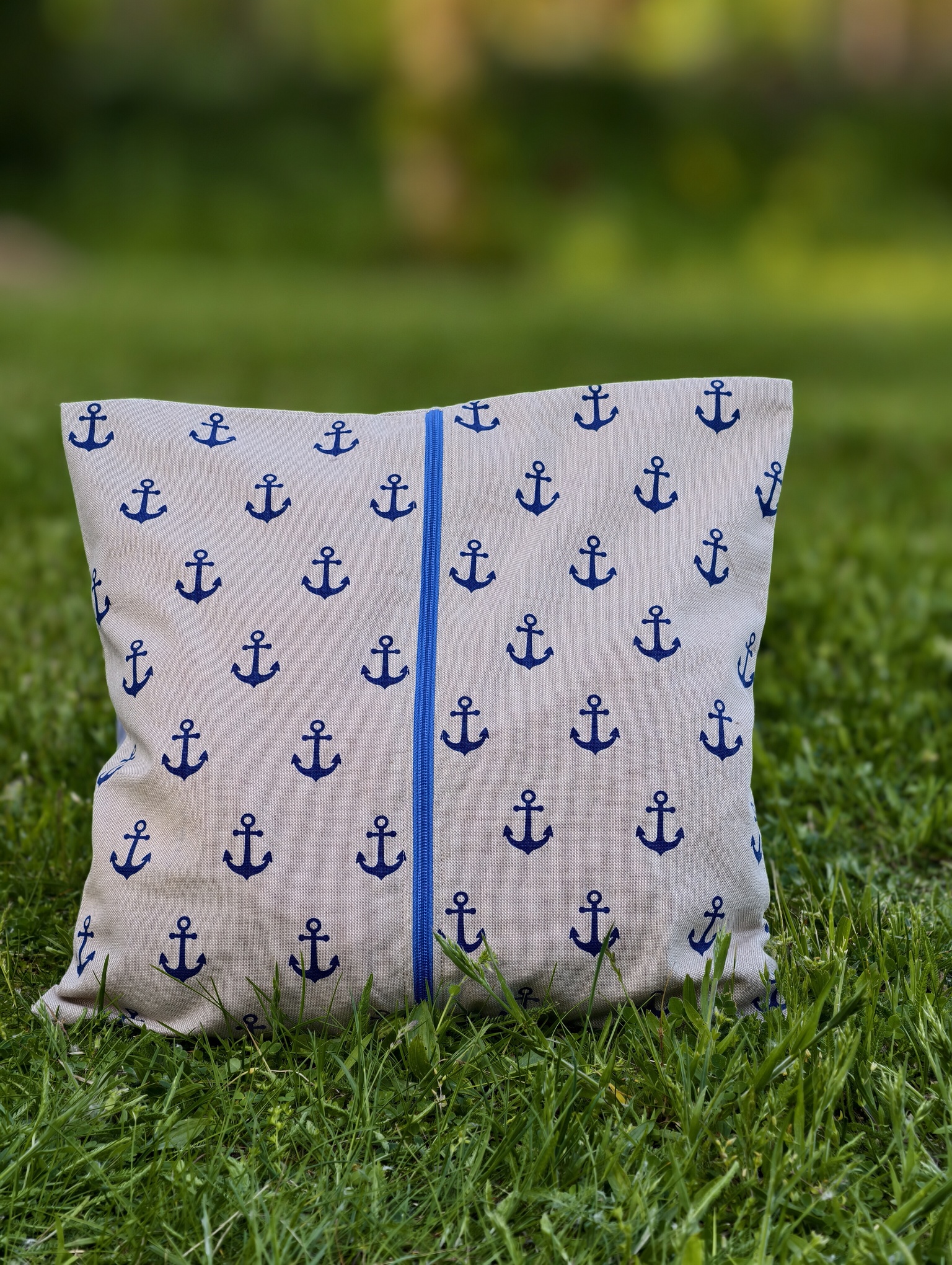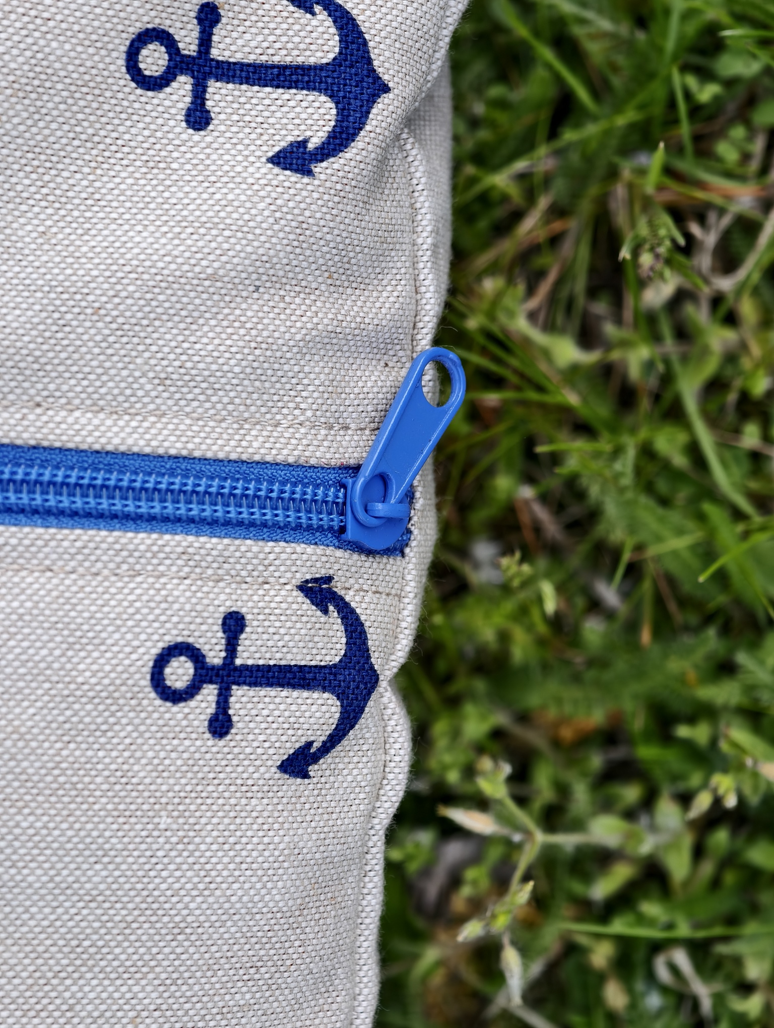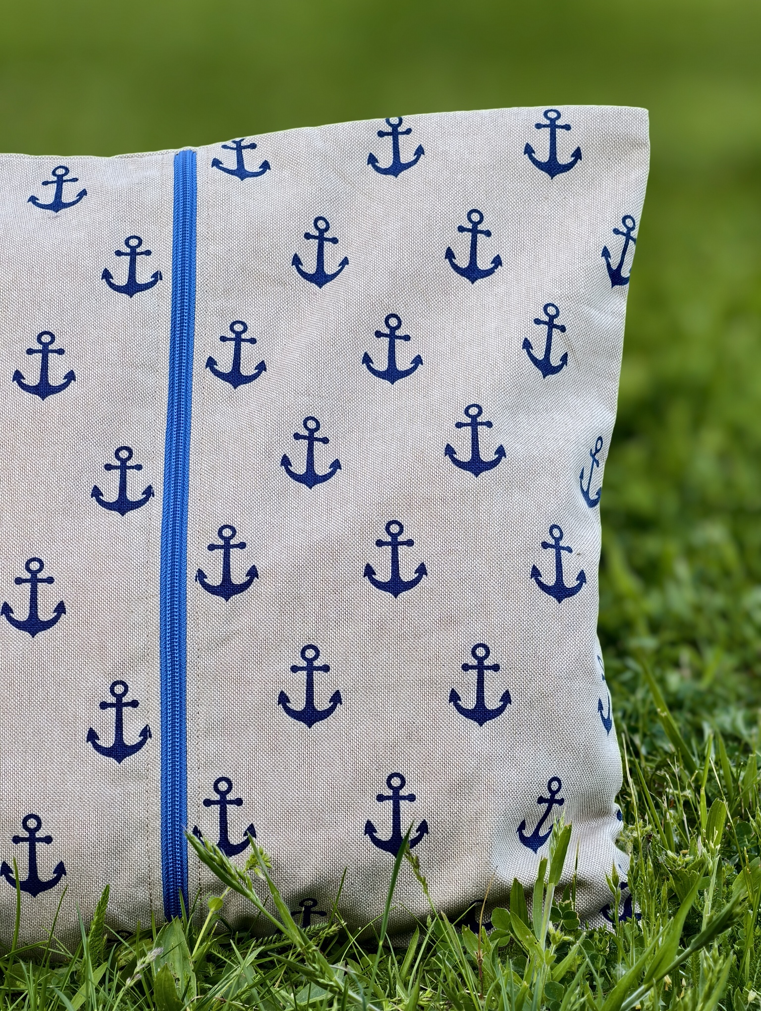 Krásný ručně šitý bavlněný povlak na polštář s potiskem kotviček. Zapínání je na zip v modré barvě.