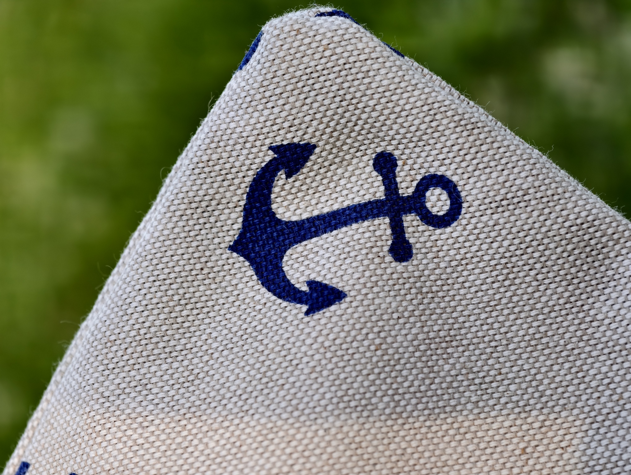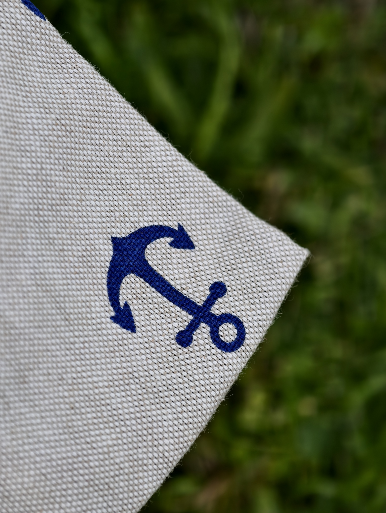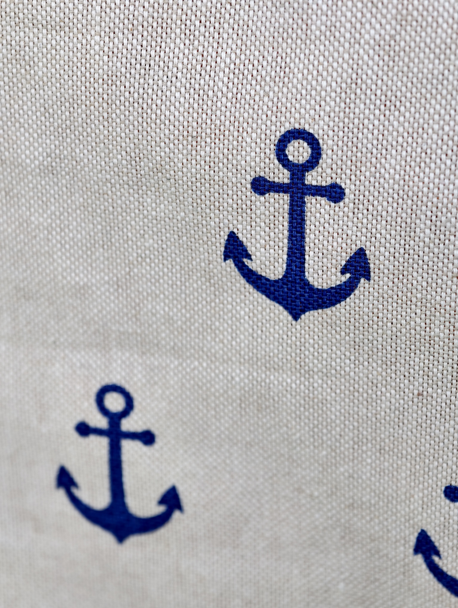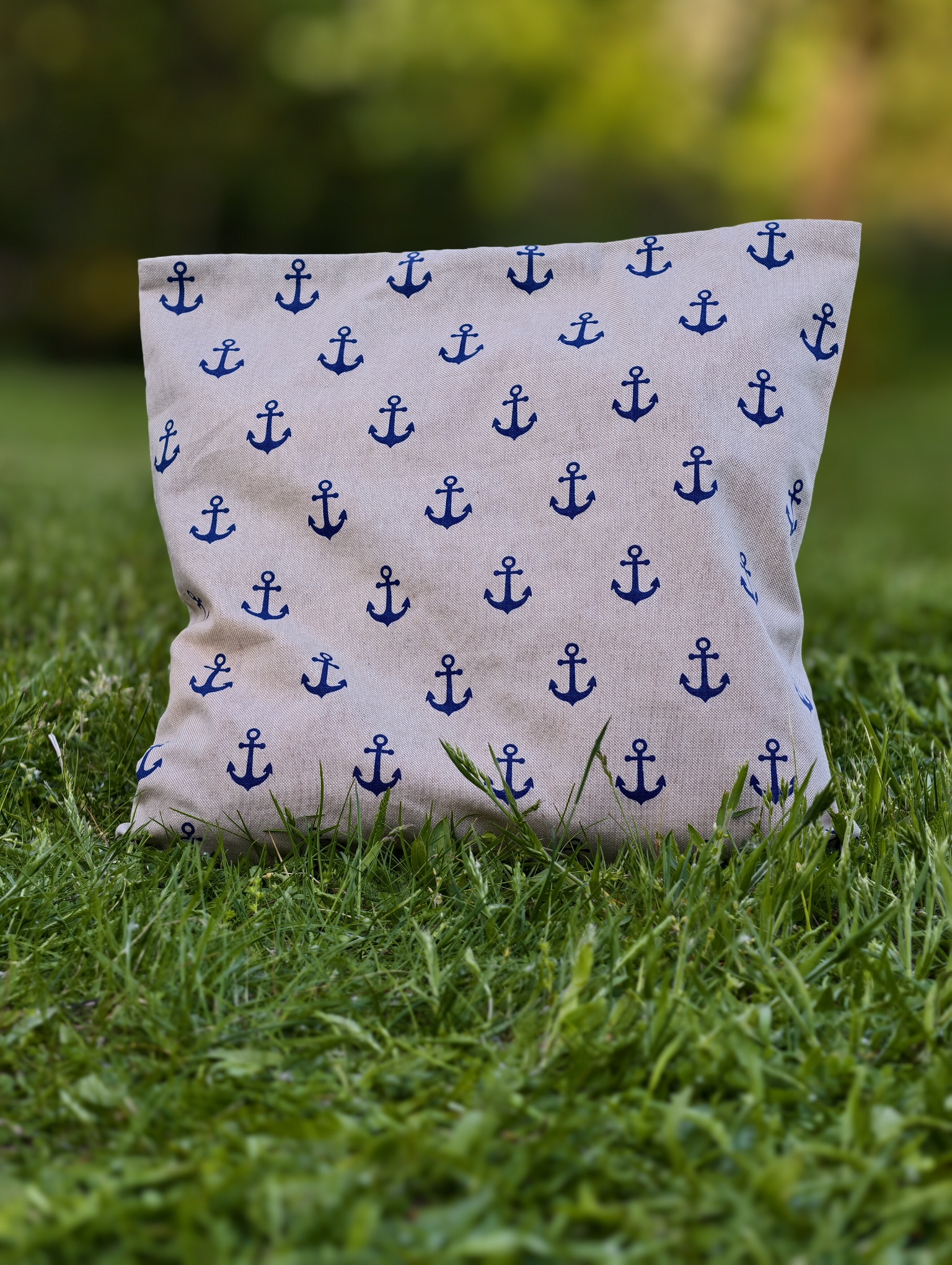 Krásný ručně šitý bavlněný povlak na polštář s potiskem kotviček. Zapínání je na zip v modré barvě.