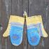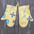Krásný ručně šitý pár kuchyňských rukavic s motivem kytiček ve veselém žluto-modrém provedení.