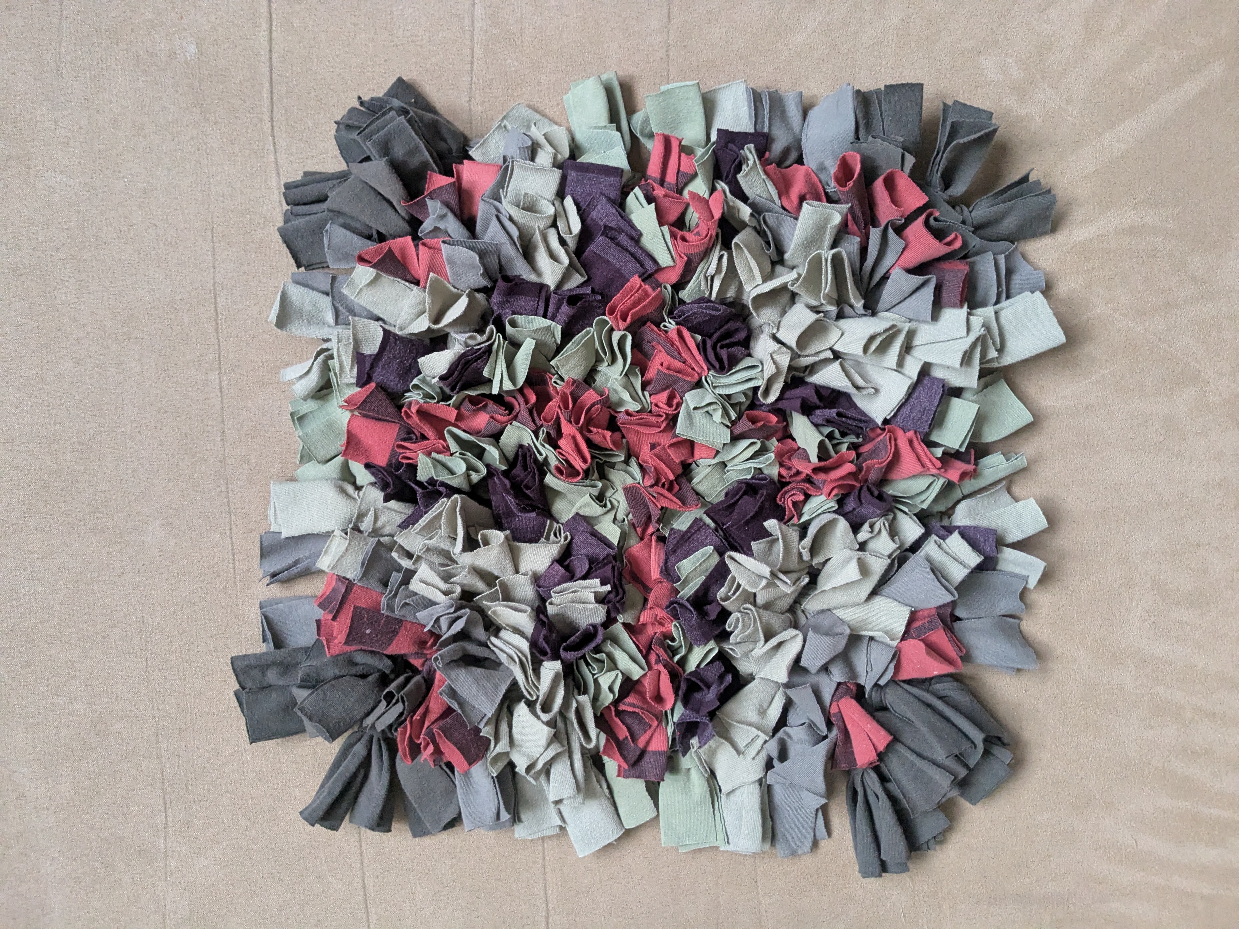 Ručně vyrobená interaktivní hračka z vysloužilého oblečení (zejména teplákoviny). Do koberečku ukryjete oblíbené pamlsky, které pejsek následně pomocí čichu hledá. Čichací podložky stimulují nejsilnější psí smysl - čich. Pejsky hledání baví a zároveň to pozitivně unaví jejich hlavu.
