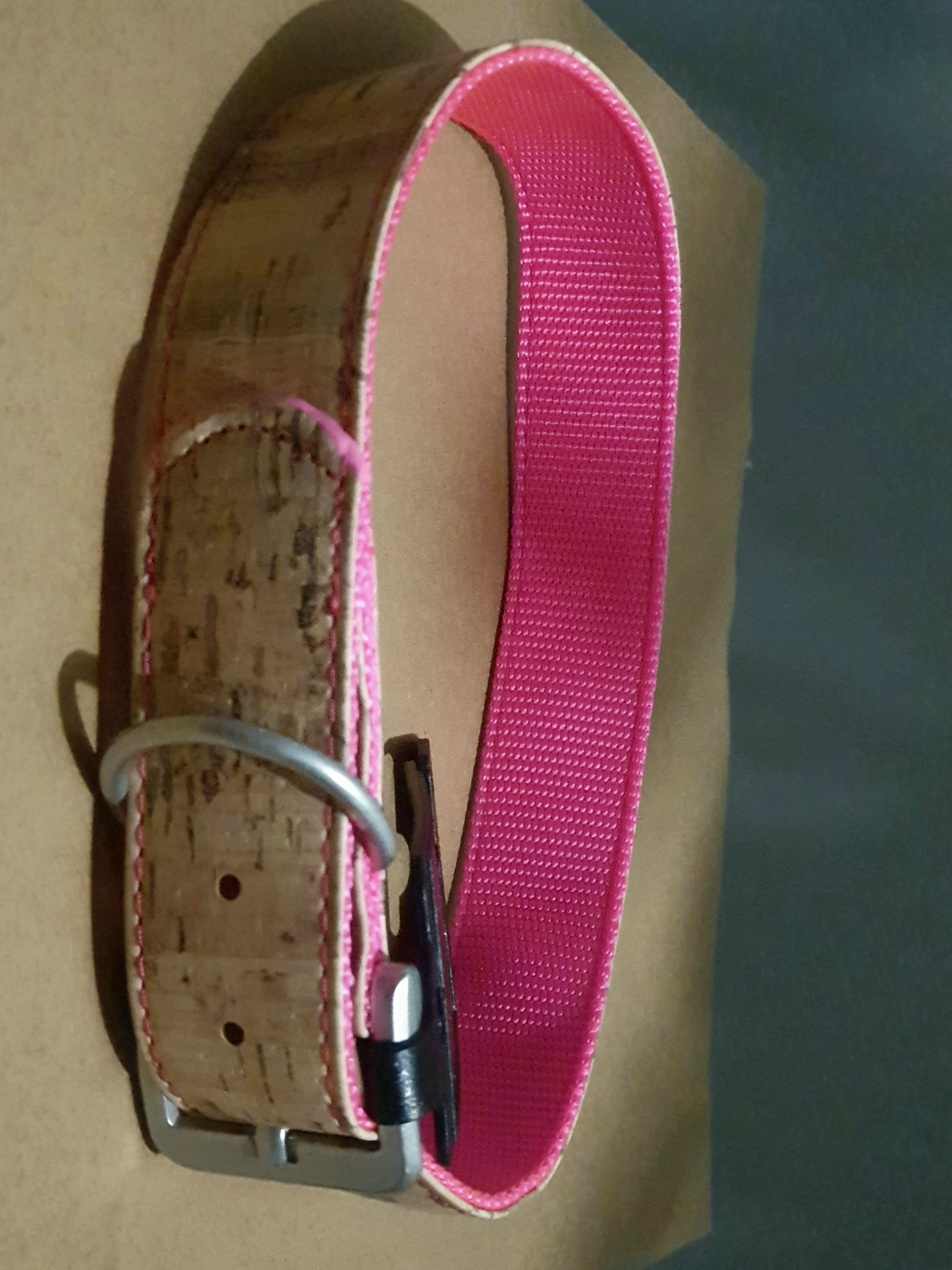 Krásný a bytelný korkový obojek podšitý výrazným růžovým nylonem. Velikost je L/XL, což odpovídá 60cm v obvodu a 30mm v šířce.